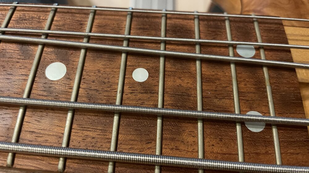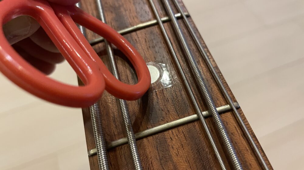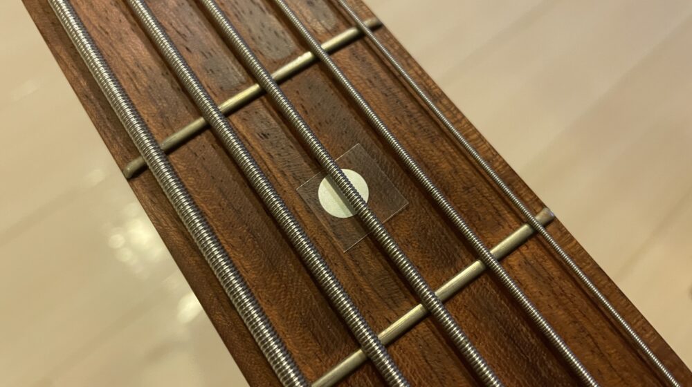 まっさらな指板のベースに、インレイステッカーを使ってポジションマークを追加できました。