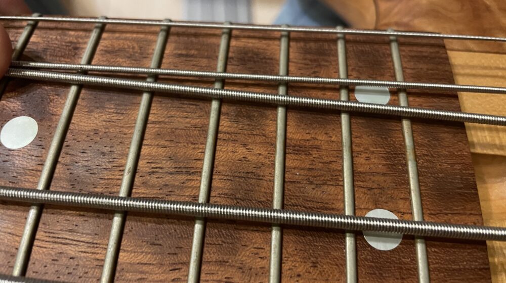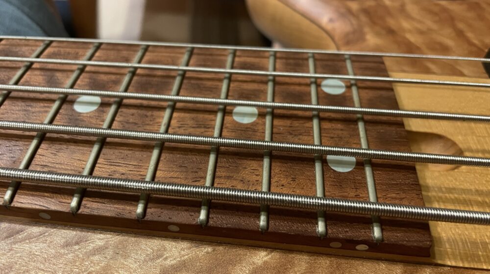 私は長く34インチのジャズベースを主に使っていたので、35インチの多弦ベースは感覚が異なり、演奏中にどこを弾いているのかわからなくなる。15フレット以上はもうお手上げである。